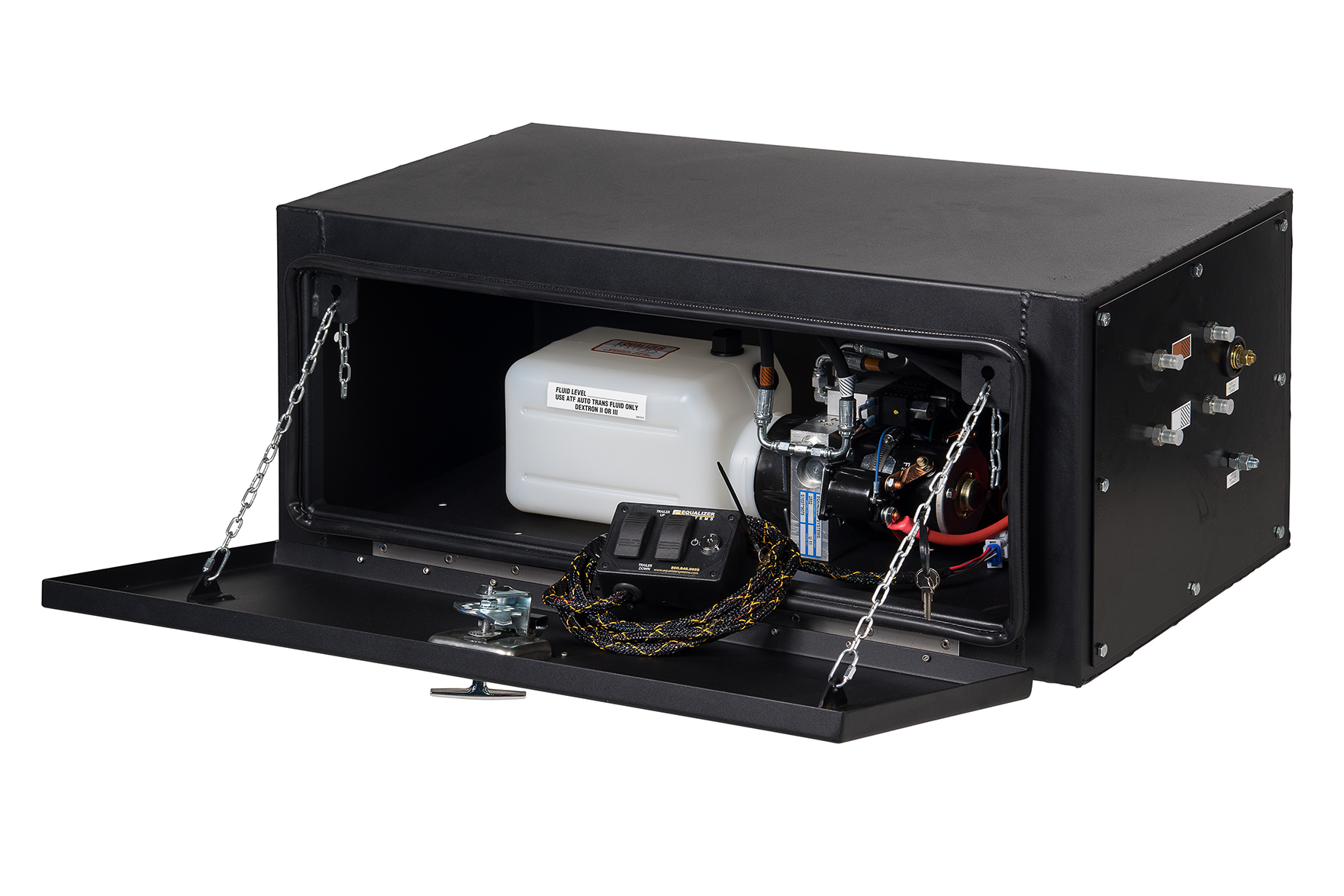 Our dual leg hydraulic landing gear by EQ Systems will make stabilizing and lifting the truck to dock height a breeze.